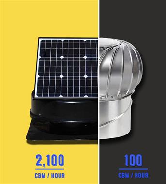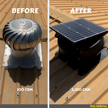 Currently, wind driven “Whirly Birds” can only exhaust around 100CBM (Cubic Metres) of air per hour while the SolarKing 320MM solar roof ventilation fan can pump 2100CBM of air per hour, more than 20x the air movement. This makes the SolarKing far more effective keeping your home or business cooler. You can even use multiple SolarKings on larger or two storey homes.